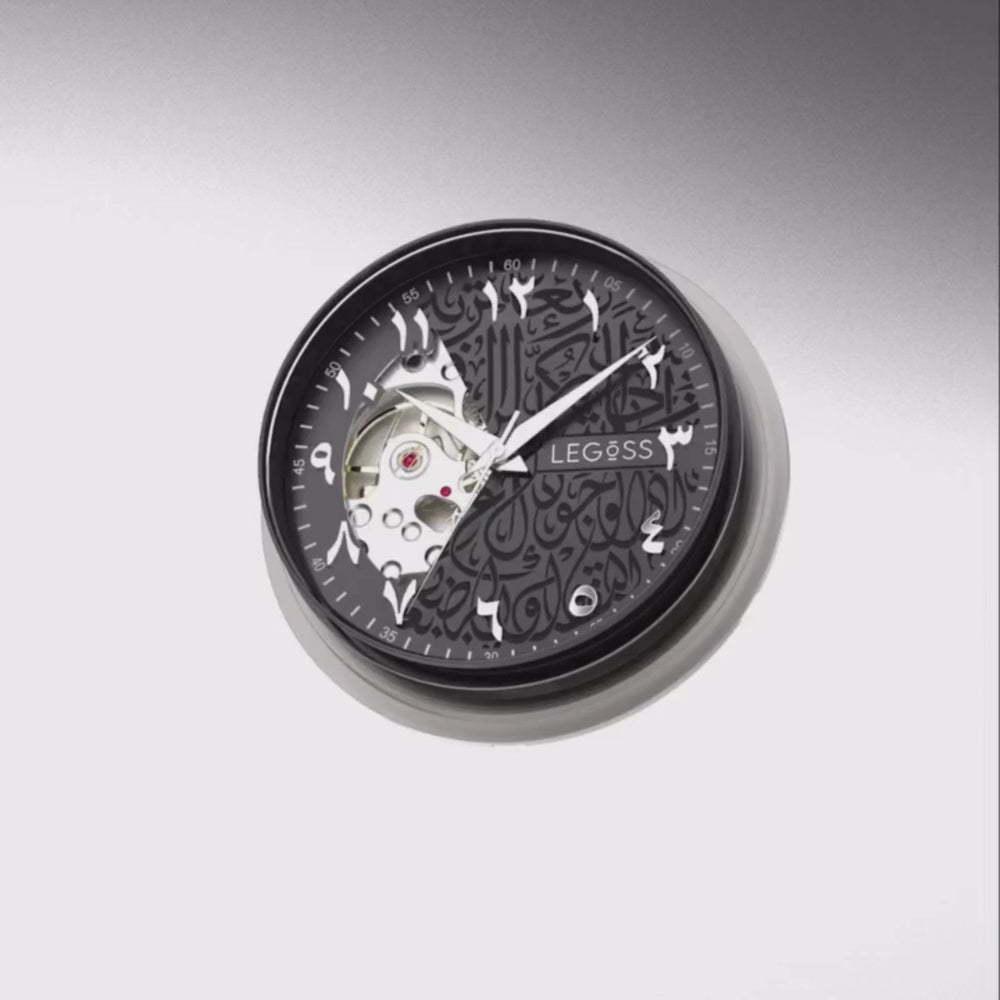 A wristwatch that is both luxurious and practical, built in a sleek style. The watch features Arabic indices that gleam against a dark background covered in Arabic calligraphy. Add a touch of class to your outfit and be assured in your appearance!