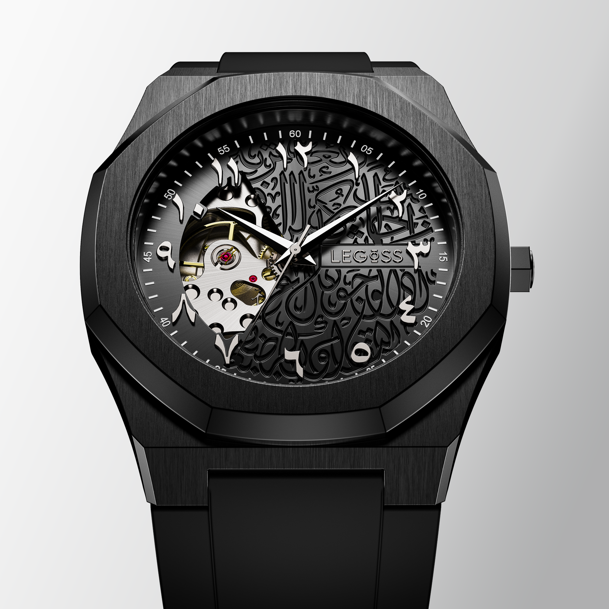 A wristwatch that is both luxurious and practical, built in a sleek style. The watch features Arabic indices that gleam against a dark background covered in Arabic calligraphy. Add a touch of class to your outfit and be assured in your appearance!